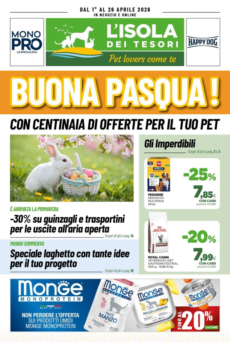 Il Volantino Isola dei Tesori Aprile 2026 è già disponibile e si presenta come uno dei più completi del periodo primaverile, con offerte valide dal 1° al 26 aprile 2026. Sfogliandolo si trovano sconti importanti su alimenti per cani e gatti, promozioni sui prodotti per cuccioli, offerte stagionali per le passeggiate all’aria aperta e una sezione dedicata alla prevenzione antiparassitaria. Non mancano poi idee per piccoli animali e perfino per chi ha un laghetto o tartarughe. È il momento giusto per organizzare la spesa per il proprio pet approfittando di sconti che arrivano fino al 30%.