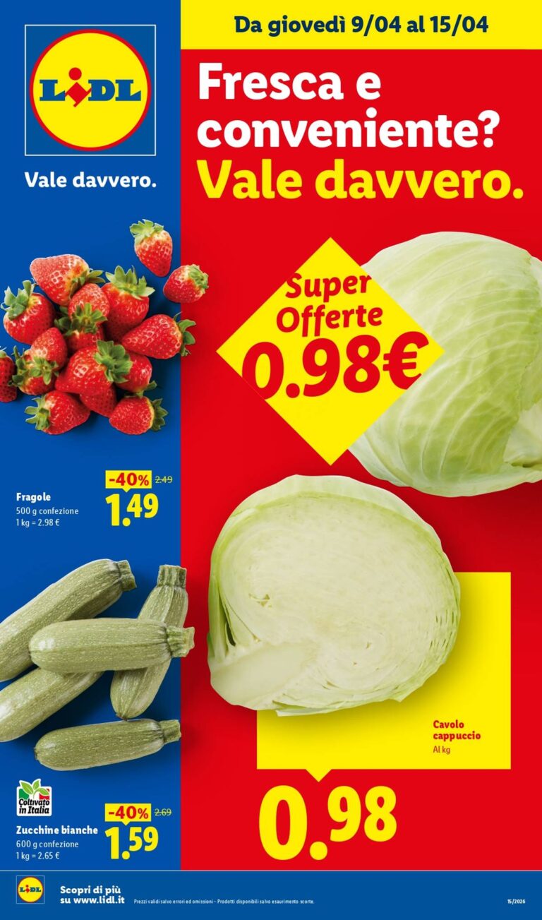 Questo volantino è valido da giovedì 9 aprile fino al 15 aprile 2026, con alcune offerte attive fino al 12 aprile, e va ad aggiungersi alle offerte del volantino Lidl dal 9 aprile 2026. Si tratta di una finestra perfetta per organizzare la spesa settimanale puntando su prodotti freschi e stagionali. In questo periodo primaverile, infatti, frutta e verdura iniziano a offrire il meglio in termini di gusto e convenienza, ed è proprio qui che Lidl costruisce una proposta molto competitiva.
