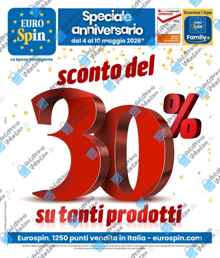 Siamo pronti a sfogliare in anteprima il volantino Eurospin dal 4 maggio 2026, che parte con una promozione che spicca subito: sconto del 30% su tanti prodotti selezionati dal 4 al 10 maggio 2026. Sfogliando le pagine si trovano offerte su freschi, dispensa, surgelati, frutta e verdura, articoli per la casa, moda estiva e perfino biciclette. Non manca uno speciale “Giro tra i Sapori”, dedicato alle eccellenze regionali italiane, oltre a tante idee regalo per la Festa della Mamma. Un volantino pensato per chi vuole riempire il carrello con attenzione al budget.