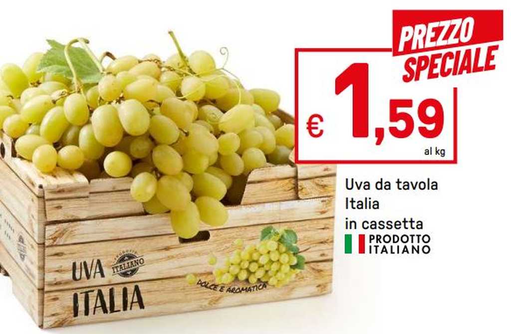 Da Eurospin, l’uva Italia viene proposta a 1,99 euro al kg. Mentre da Iper l’offerta è ancora più interessante, in quanto proposta a 1,59 euro al kg, ma in questo caso bisogna acquistare una cassetta intera. Anche Bennet offre l’uva Italia, ma in questo caso viene specificato che si tratta della varietà di Mazzarrone IGP, al prezzo di 2,45 euro al kg.