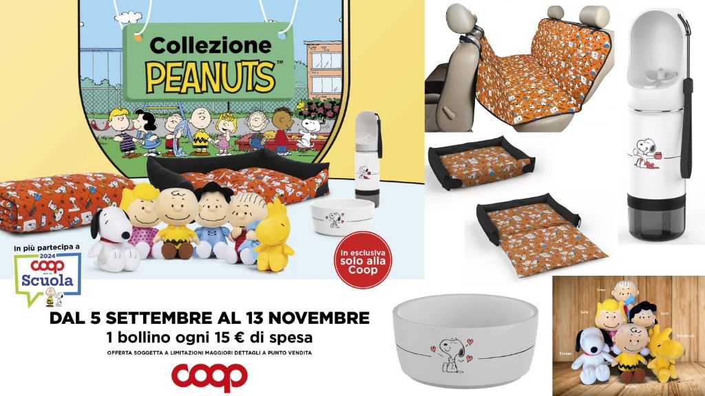 Dal 5 settembre al 13 novembre 2024, Coop lancia la nuova collezione dedicata agli amati personaggi dei Peanuts, disponibili in diversi punti vendita come Coop Lombardia, Coop Alleanza 3.0, Unicoop Tirreno e NovaCoop. Questa iniziativa prevede la raccolta di bollini, con cui è possibile ottenere premi pensati sia per bambini che per i loro amici a quattro zampe.