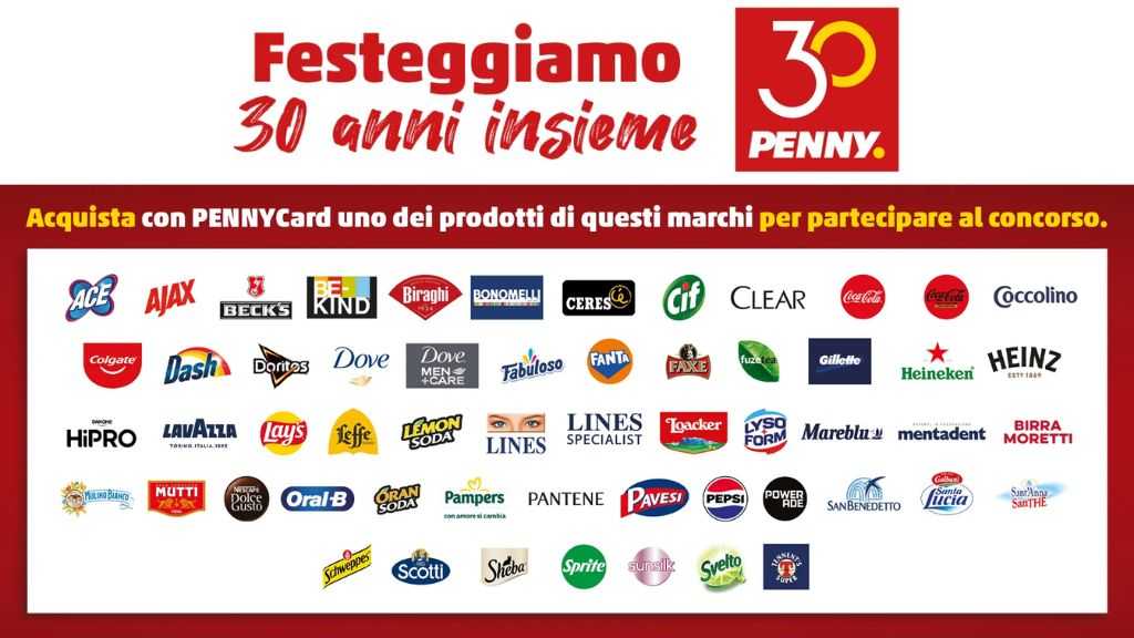 Penny Market celebra il suo 30º anniversario con il concorso “Festeggiamo insieme 30 anni” che si svolgerà dal 12 settembre al 6 ottobre 2024, mettend in palio oltre 3000 buoni spesa da 30 euro e la possibilità di vincere un anno di spesa gratuita. Per partecipare, è sufficiente acquistare almeno un prodotto sponsor con la propria PENNYCard presso uno dei punti vendita.