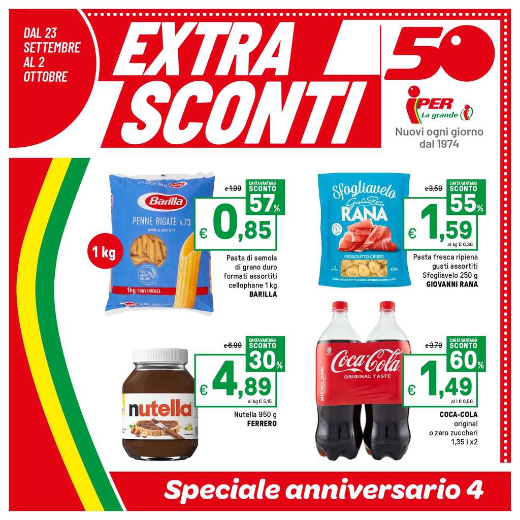 Il volantino Iper dal 23 settembre al 2 ottobre 2024, si intitola “Extra Sconti” e propone un’ampia gamma di offerte su prodotti alimentari e non food. Tra le offerte più interessanti, spiccano gli sconti sulla Coca-Cola da 1,35 litri, venduta in confezioni da due bottiglie con il 60% di sconto, e sulla Nutella Ferrero da 950 g, offerta con uno sconto del 30%. Per chi ama la pasta potrà approfittare delle promozioni sulla pasta fresca Giovanni Rana, con il 55% di sconto, e sulla pasta di semola Barilla, in formati assortiti da 1 kg, venduta con il 57% di sconto.