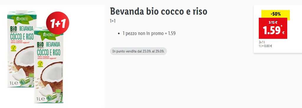 Nel mare di offerte proposte dai supermercati, districarsi tra promozioni e sconti diventa sempre più una sfida per i consumatori attenti alla salute. Il volantino Lidl dal 23 al 29 settembre 2024, non fa eccezione: un tripudio di prodotti che spaziano dai latticini ai salumi, dai dolci ai piatti pronti. Ma qual è il prodotto più salutare di questa settimana? Dopo un’attenta analisi, abbiamo trovato la risposta: la bevanda Bio di cocco e riso del marchio Vemondo Bio Organic.