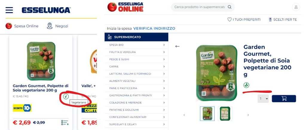 Durante una recente visita al sito di Esselunga, ho notato un dettaglio interessante. Navigando tra i prodotti in offerta del volantino di questa settimana, quando sono arrivata nella sezione Alimenti Vegetali, mi sono soffermata sulle Polpette di Soia Vegetariane Garden Gourmet, che sono chiaramente indicate anche nel titolo come “vegetariane”. Accanto all’immagine del prodotto, Esselunga aggiunge un simbolo con la lettera “V” e, passando con il cursore del mouse sopra il simbolo, la descrizione risulta essere “Vegetariano”.