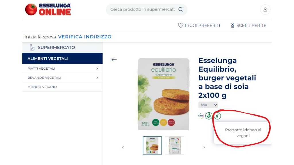 Passando però alla fase degli acquisti sul sito Esselunga Spesa Online, ho notato che lo stesso simbolo “V” non era più presente per queste polpette. Invece, ho trovato il simbolo su altri prodotti, ma con una descrizione diversa, ovvero “Prodotto idoneo ai vegani”. Questo mi ha fatto riflettere sull’importanza di comprendere bene i simboli e le etichette.