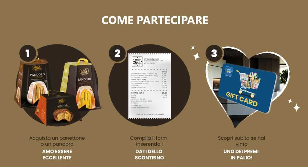 - Acquista almeno un prodotto della linea Amo Essere Eccellente tra quelli selezionati, come il Panettone con scorza di arance e cedro, o il Pandoro farcito con crema al pistacchio.