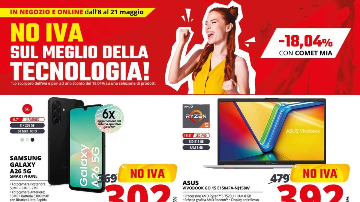 Il nuovo volantino Comet è valido dall’8 al 21 maggio 2025, offrendo un’ampia gamma di sconti su tecnologia, elettrodomestici e mobilità elettrica. In questa edizione, Comet propone il “No IVA” su una selezione di prodotti di alta tecnologia, con uno sconto del 18,04% su smartphone, laptop, lavatrici e molto altro.