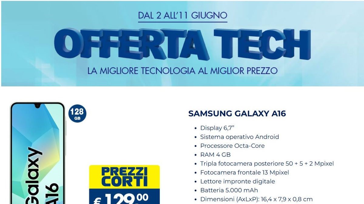Esselunga Offerta Tech dal 2 giugno 2025 e preparati a fare il pieno di tecnologia al miglior prezzo. L’insegna propone un’offerta valida fino all’11 giugno 2025, ovvero il Samsung Galaxy A16, un dispositivo completo con memoria da 128 GB e prezzo ultra competitivo. Quando inizia l’Offerta Tech Esselunga ? Esselunga Offerta Tech è valido dal 2 all’11 giugno 2025. È una promozione speciale dedicata agli amanti della tecnologia e a chi vuole cogliere l’occasione per acquistare uno smartphone o un dispositivo elettronico senza spendere troppo. Si tratta di una campagna promozionale a tempo limitato, perfetta per chi cerca qualità e convenienza.