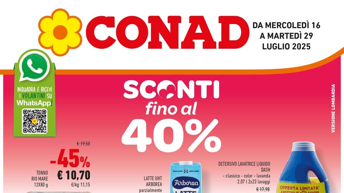 Sfoglia il volantino Conad Lombardia dal 16 luglio 2025: sconti fino al 55%, offerte su tonno Rio Mare, latte, detersivi e buoni da 10€.