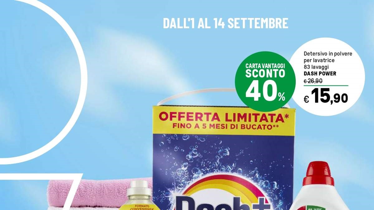 Sfogliando il volantino saltano subito all’occhio le grandi promozioni. Il detersivo in polvere Dash Power da 83 lavaggi è proposto a soli 15,90 euro con Carta Vantaggi, con un risparmio del 40%. Per completare il bucato non può mancare l’ammorbidente Lenor concentrato da 71 lavaggi a 4,49 euro. Molto interessante anche il Dixan Classico formato scorta da 66 lavaggi a 11,99 euro e il detersivo liquido Omino Bianco 50 lavaggi con uno sconto del 60%, disponibile a soli 3,99 euro.